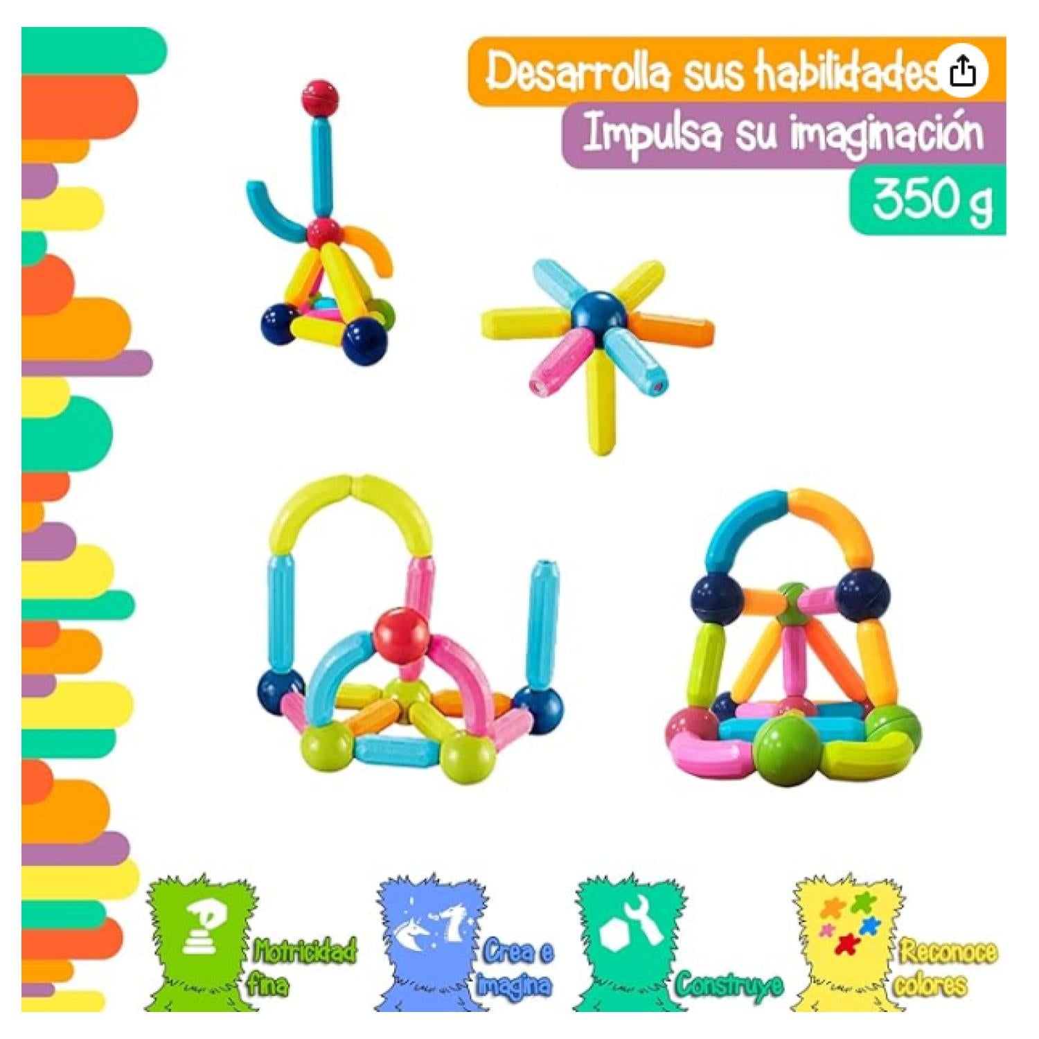 Este set de 25 barras magnéticas es ideal para fomentar la creatividad, la imaginación y el aprendizaje temprano de los niños. Cada pieza viene en colores vibrantes y está diseñada para conectarse con fuerza gracias a su magnetismo estable, permitiendo construir una amplia variedad de formas y estructuras.