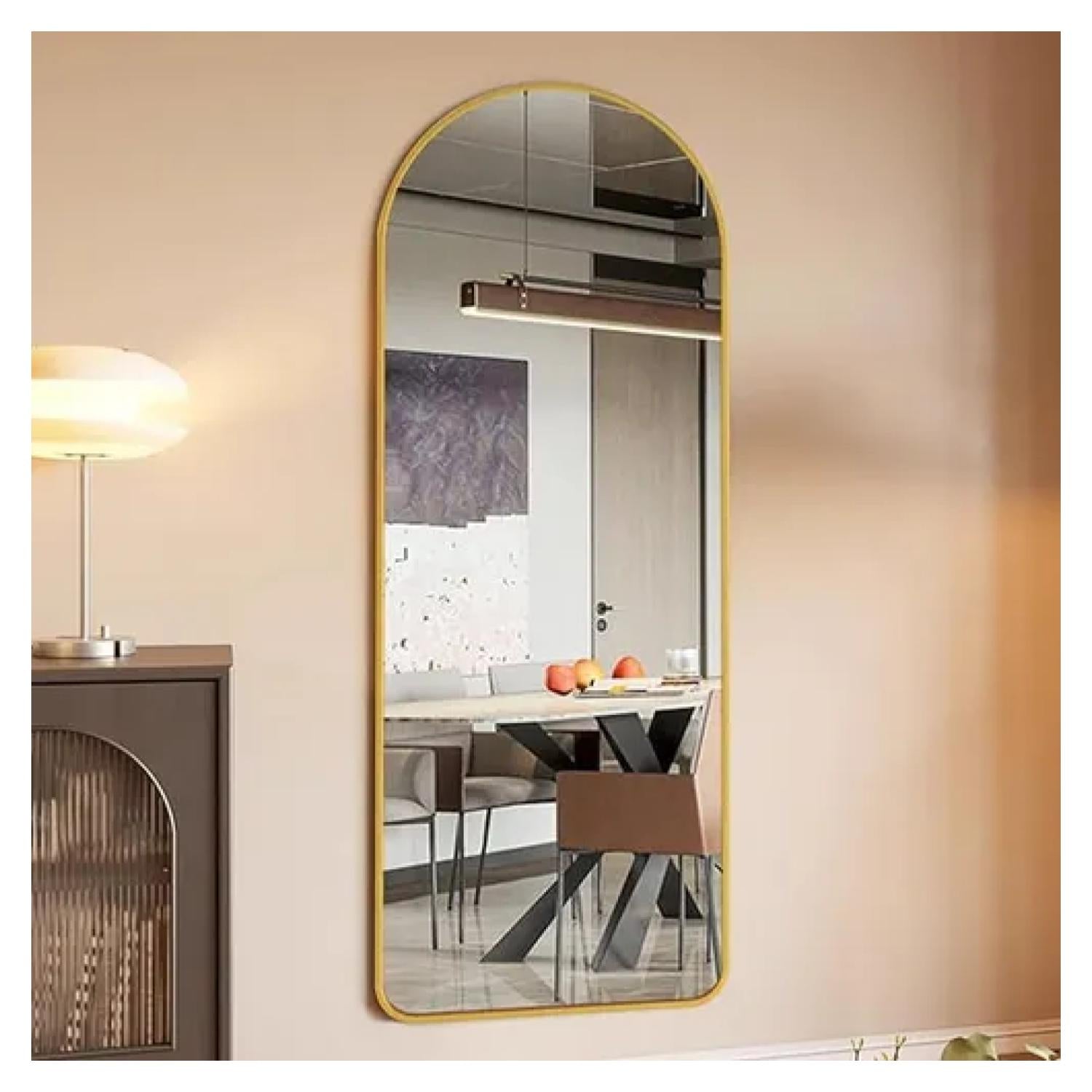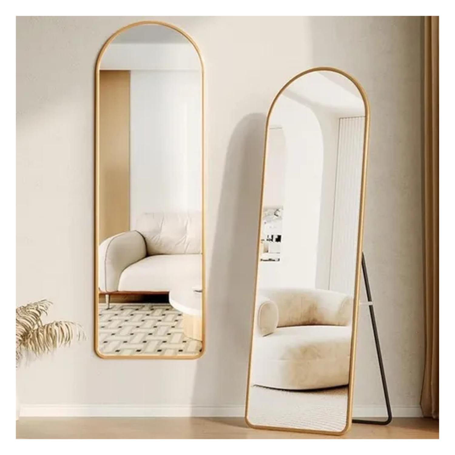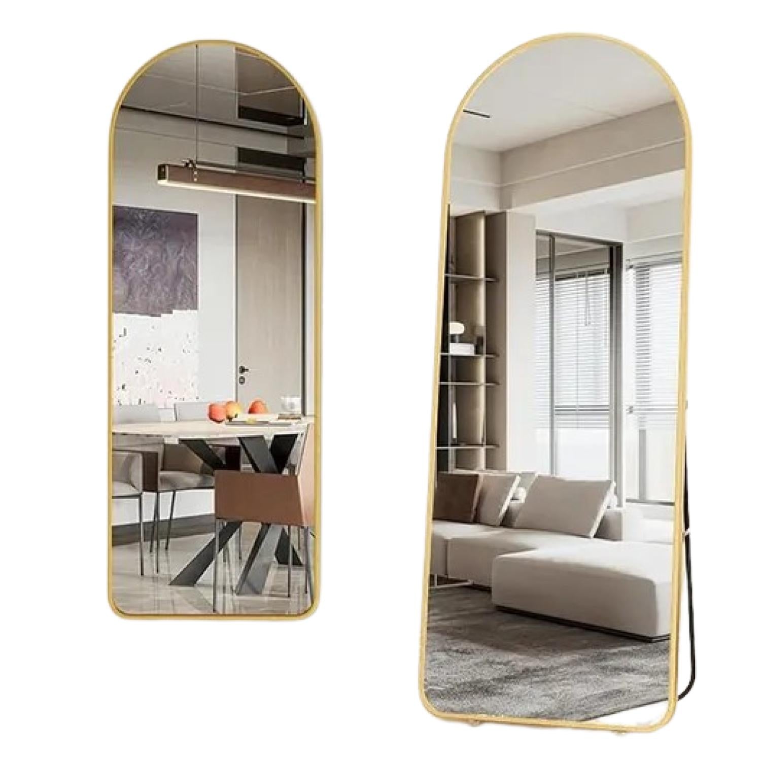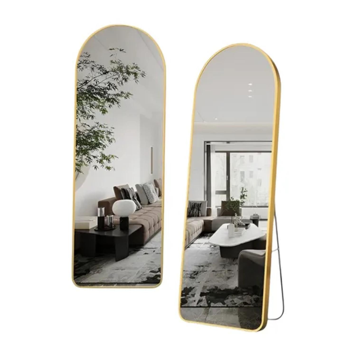 Este elegante espejo decorativo de cuerpo completo destaca por su diseño arqueado y marco superior sin costuras, que aporta sofisticación y modernidad a cualquier espacio. Su estructura de acero inoxidable, disponible en acabado dorado o negro, combina estilo y resistencia, ideal para quienes buscan funcionalidad sin renunciar al diseño.