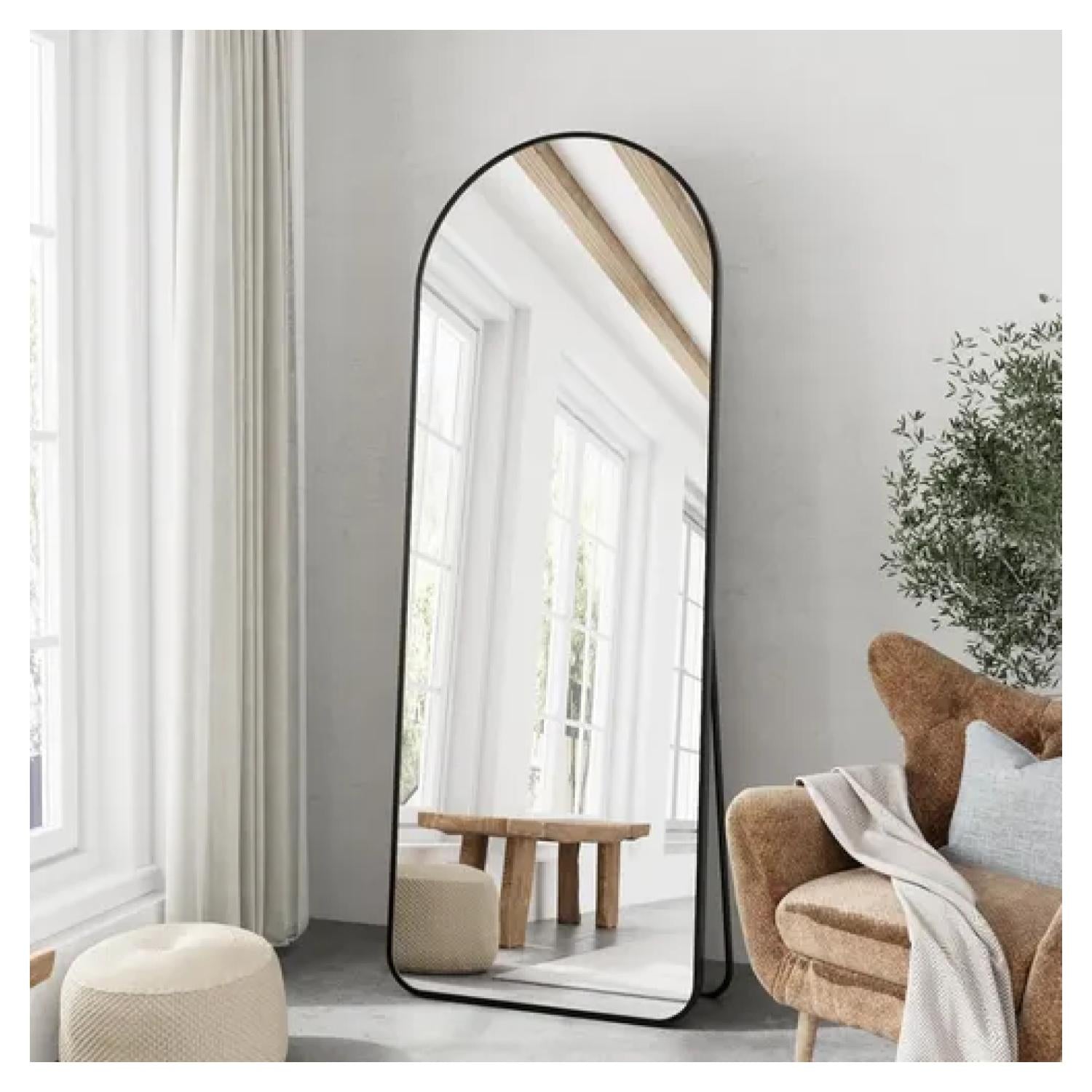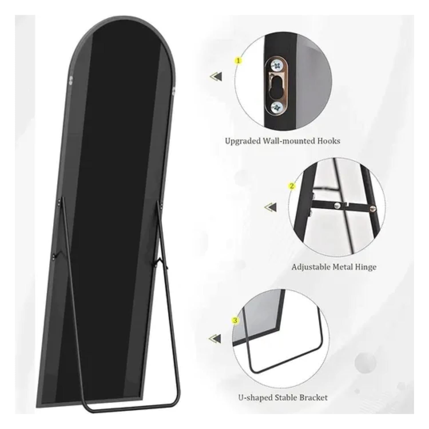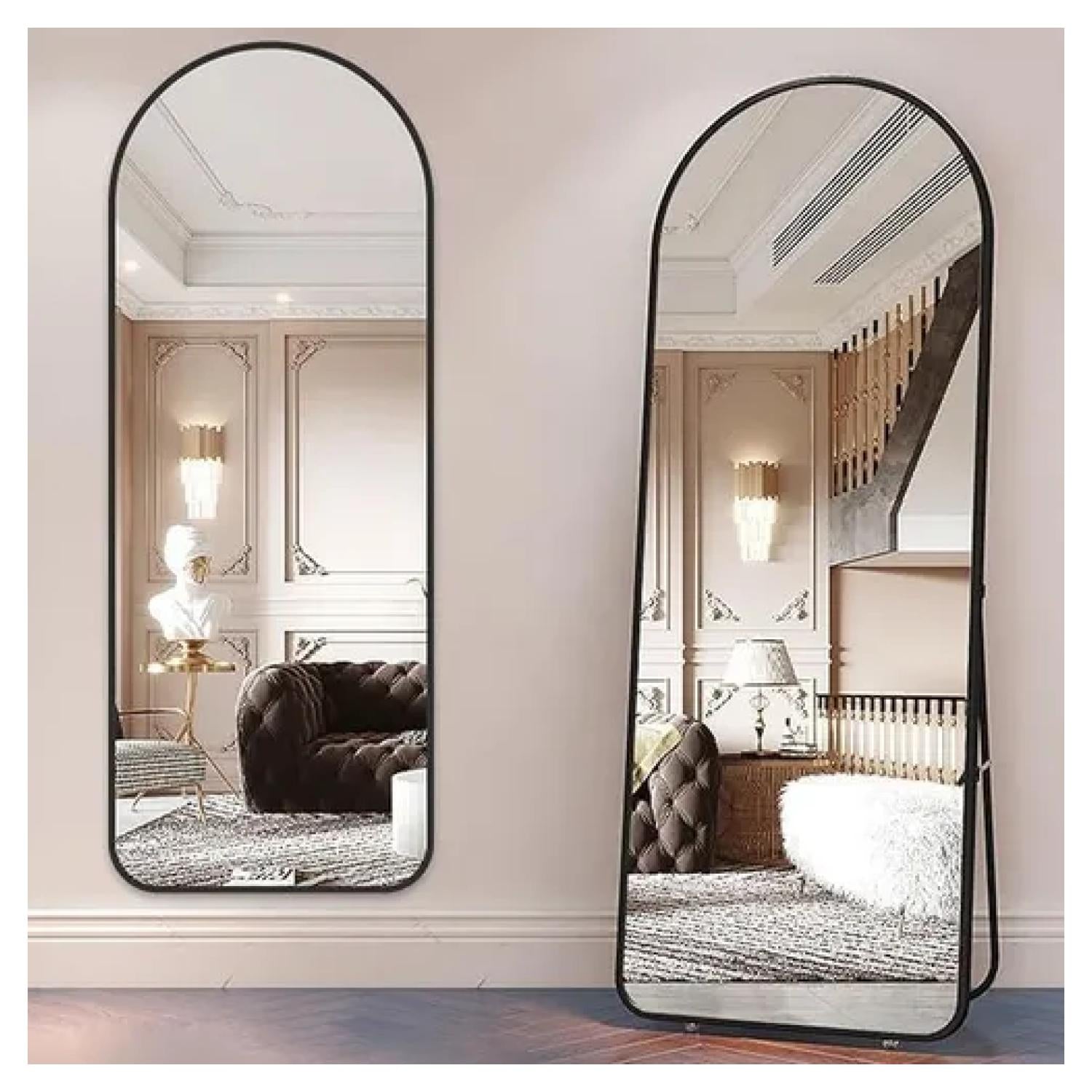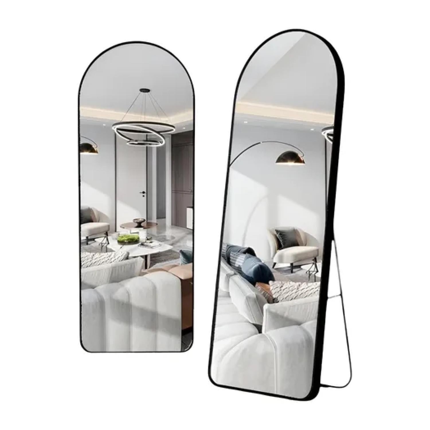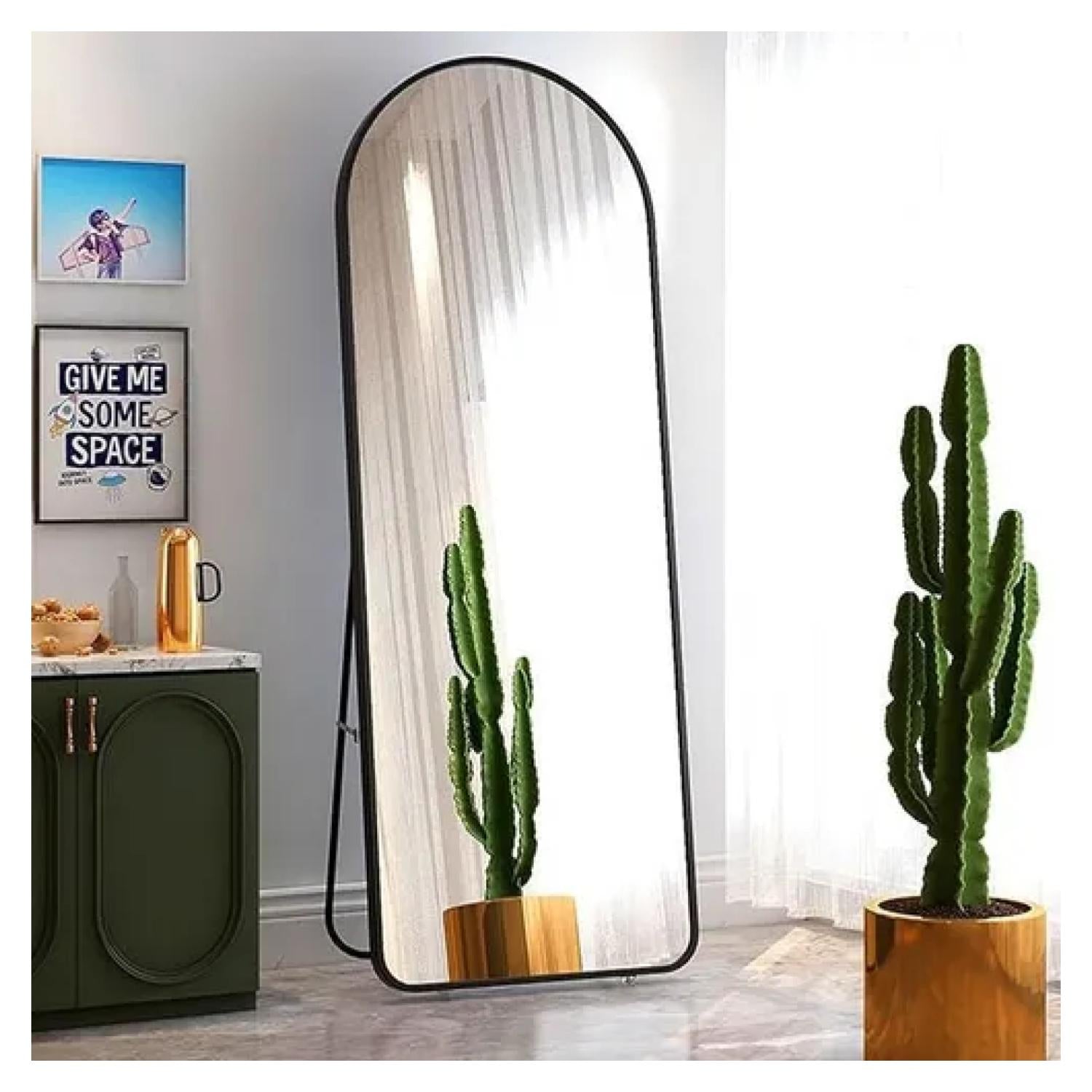 Este elegante espejo decorativo de cuerpo completo destaca por su diseño arqueado y marco superior sin costuras, que aporta sofisticación y modernidad a cualquier espacio. Su estructura de acero inoxidable, disponible en acabado dorado o negro, combina estilo y resistencia, ideal para quienes buscan funcionalidad sin renunciar al diseño.